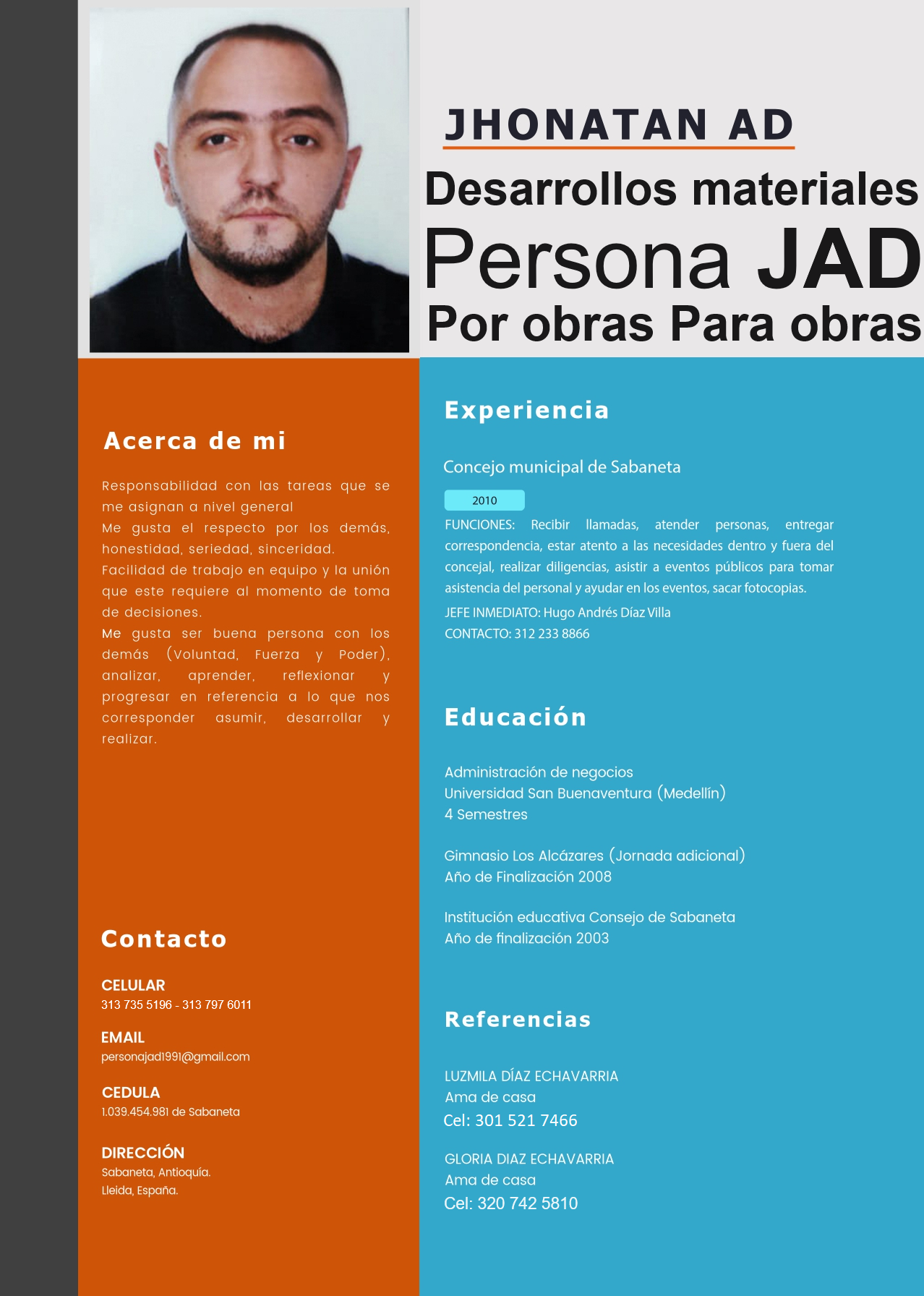Actualmente, me dedico al trabajo que Dios me concedió: desarrollos materiales y Persona JAD Por obras Para obras a nivel mundial. Dirigido a personas públicas, empresas, empresas deportivas, deportistas, entrenadores y demás organizaciones y personas que se interesen para desarrollar y realizar obras y proyectos.